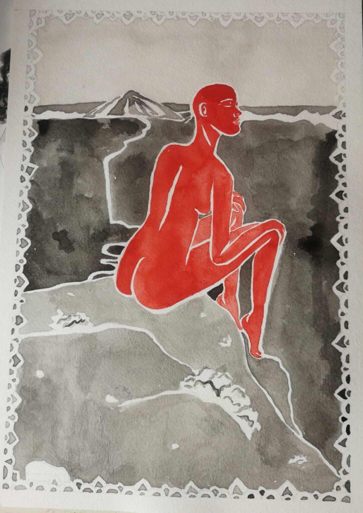 La technique ? Aquarelle et collage. Des vives couleurs à l’aquarelle côtoient différents niveaux de gris. Cette série raconte l’état d’âme, les sentiments et douleurs qui peuvent traverser un corps. Les nuances de gris fonctionnent comme des cicatrices, des marques qui s’inscrivent dans le corps de la femme. Sur certaines pièces, une figure rouge éclatante se détache sur des lavis gris évoquant les nuées volcaniques. Le Piton des Neiges se profile en arrière-plan. Le corps assis contemple le paysage, ancré dans la terre péi. La végétation pousse en filigranes autour de la silhouette, créant un écrin naturel. Sur d’autres, des silhouettes en niveaux de gris se mêlent à la végétation luxuriante. Les corps ne sont pas dans le paysage – ils sont le paysage. Les îlots de verdure poussent comme des cheveux, comme une extension organique du corps féminin.
