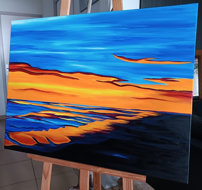 D’un point de vue critique, la peinture acrylique choisie par Marie lui permet de capturer avec éclat la lumière et les couleurs vibrantes de l’île de la Réunion. Son utilisation ingénieuse de la symbolique des animaux totem ajoute une profondeur spirituelle à son travail, offrant aux observateurs une invitation à explorer la connexion entre l’homme et la nature. En immortalisant la majesté des couchers de soleil à travers ses œuvres, elle crée une expérience visuelle captivante, transportant ceux qui contemplent ses tableaux dans un monde où le temps semble suspendu, où la beauté éphémère de la vie est célébrée avec éloquence.